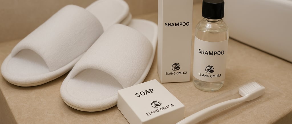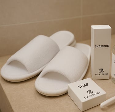 Tingkatkan kenyamanan tamu Anda dengan produk amenities hotel premium dari Elang Omega — sabun, shampoo, sikat gigi, sandal, dan perlengkapan spa yang dirancang dengan kualitas tinggi dan tampilan elegan.